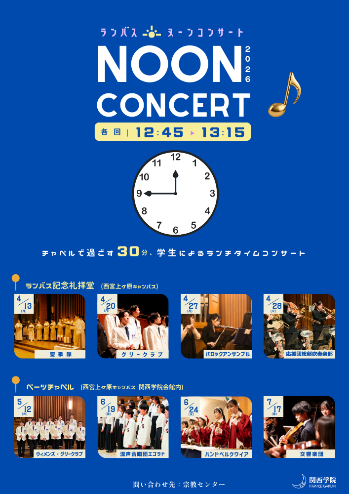 ※2026年度は、ランバス記念礼拝堂(西宮上ケ原キャンパス)のオルガン設置工事に伴い、一部関西学院会館内のベーツチャペルにて開催いたします。
