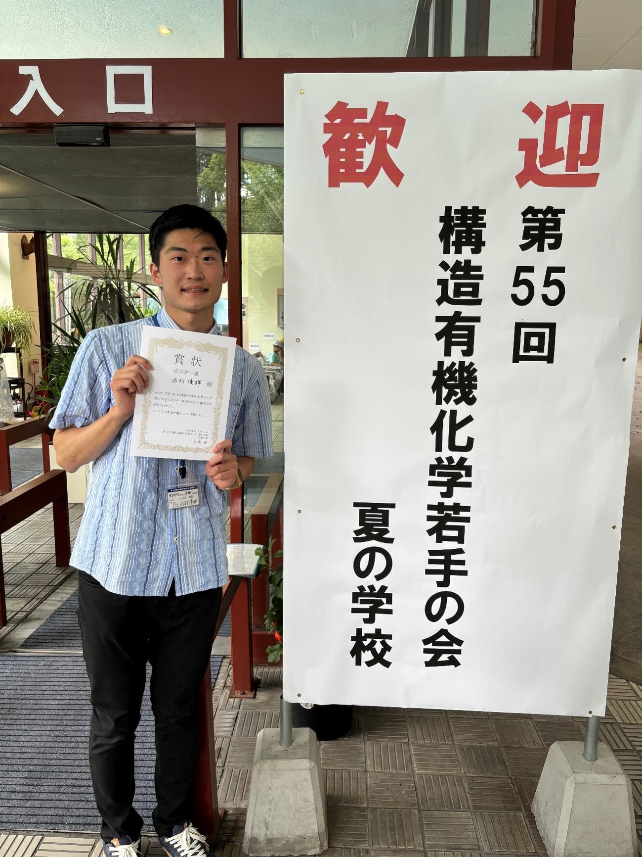 西村優輝さん(理工学研究科 博士課程前期課程2年生 化学専攻 倉橋拓也研究室)が7月29日から7月31日にかけて大阪で開催された第55回 構造有機化学若手の会 夏の学校において「ポスター賞」を受賞しました。