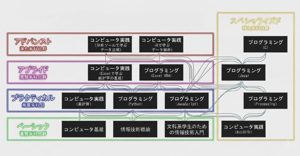 情報科学科目は、4つのステップ(ベーシック・プラクティカル・アプライド・アドバンスト)と、それを補完し学びを深める科目群(スペシャライズド)で構成され、1つのスキルツリーを形成しています。