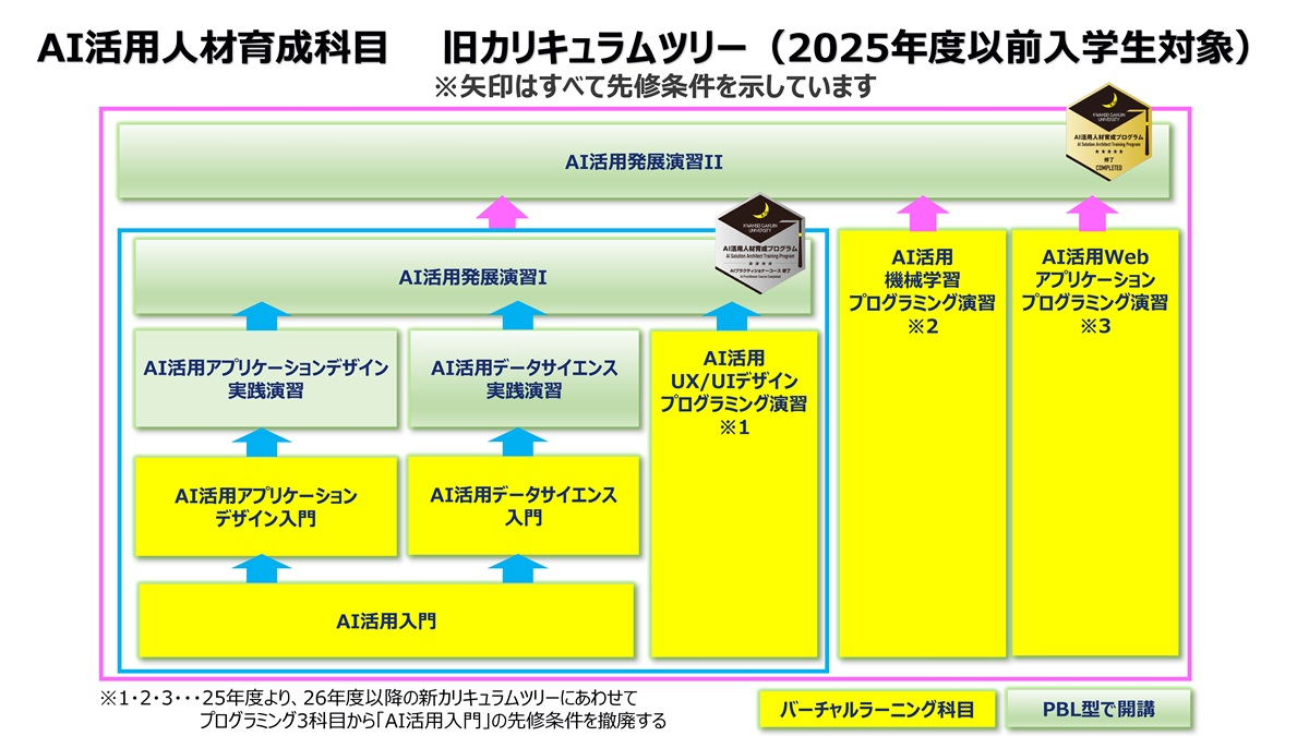 できます。全9科目のうち、AI活用入門・AI活用アプリケーションデザイン入門・AI活用データサイエンス入門・AI活用機械学習プログラミング演習・AI活用Webアプリケーションプログラミング演習・AI活用UX/UIデザインプログラミング演習の6科目を完全バーチャルラーニング科目として開講しています。