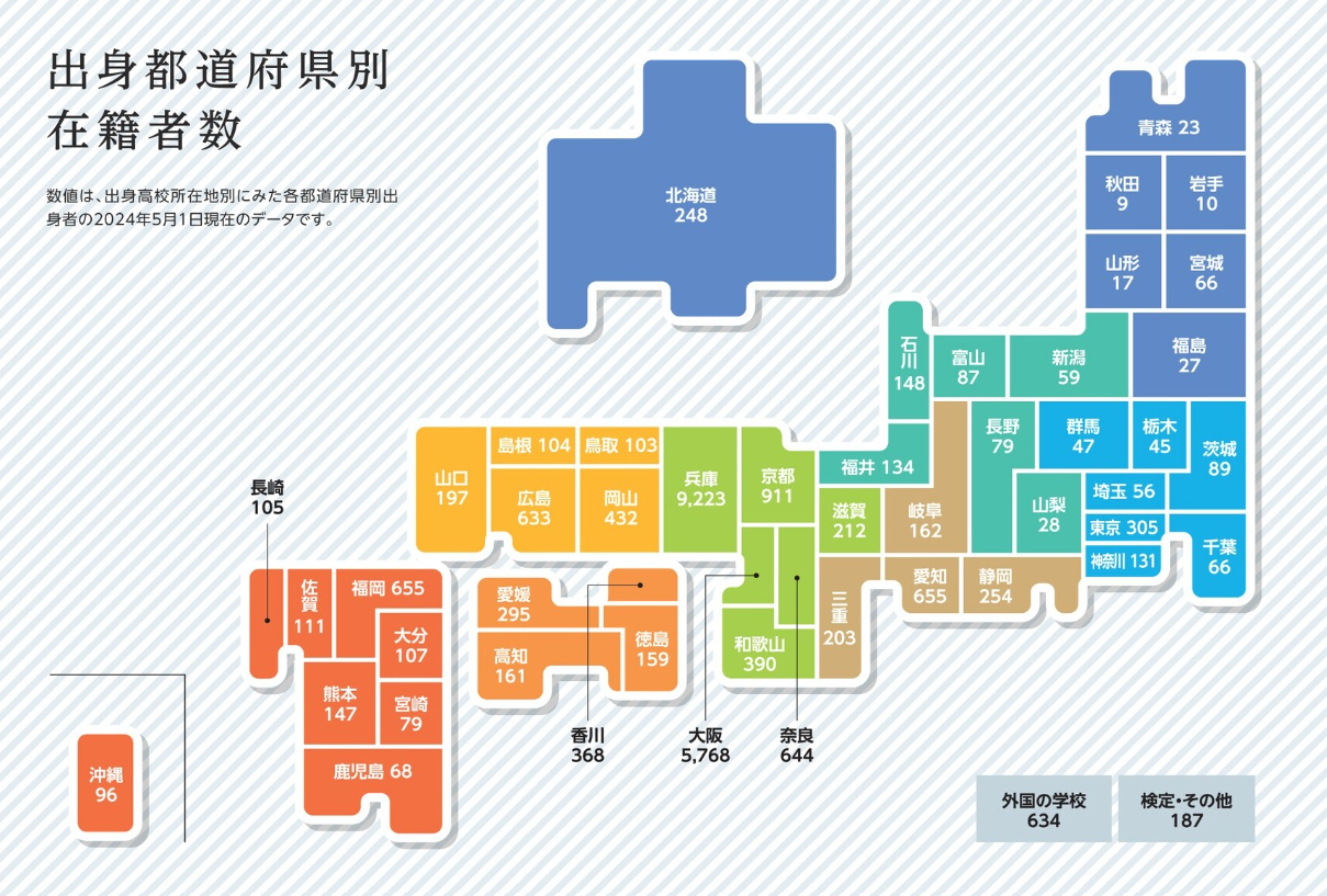 関西学院大学には、全国47都道府県から学生が集まっています。