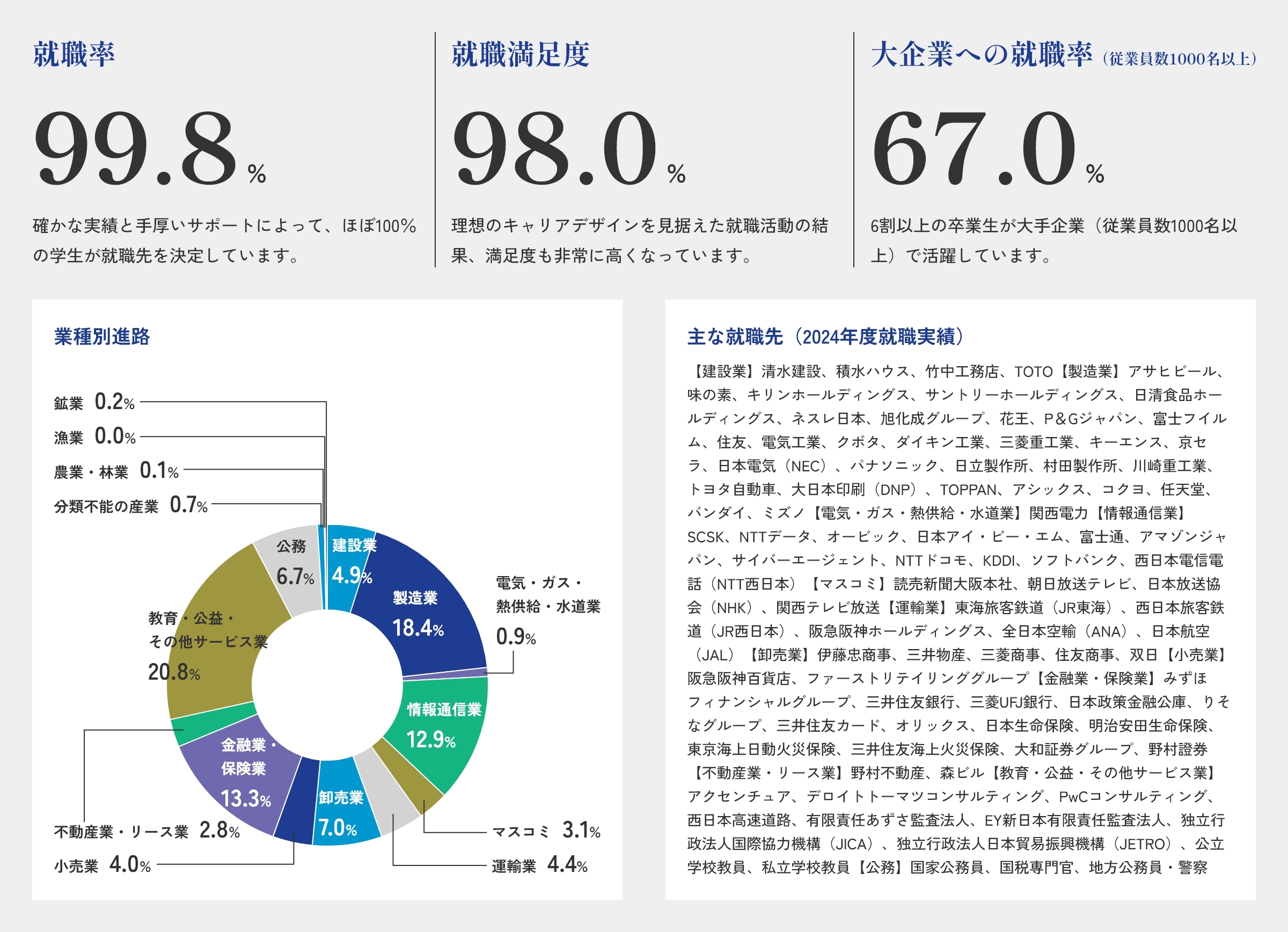 関西学院大学の就職率は全国でもトップレベル。さらに、就職先への満足度も例年高く、単に就職するだけでなく、志望度の高い企業への就職を実現できています。