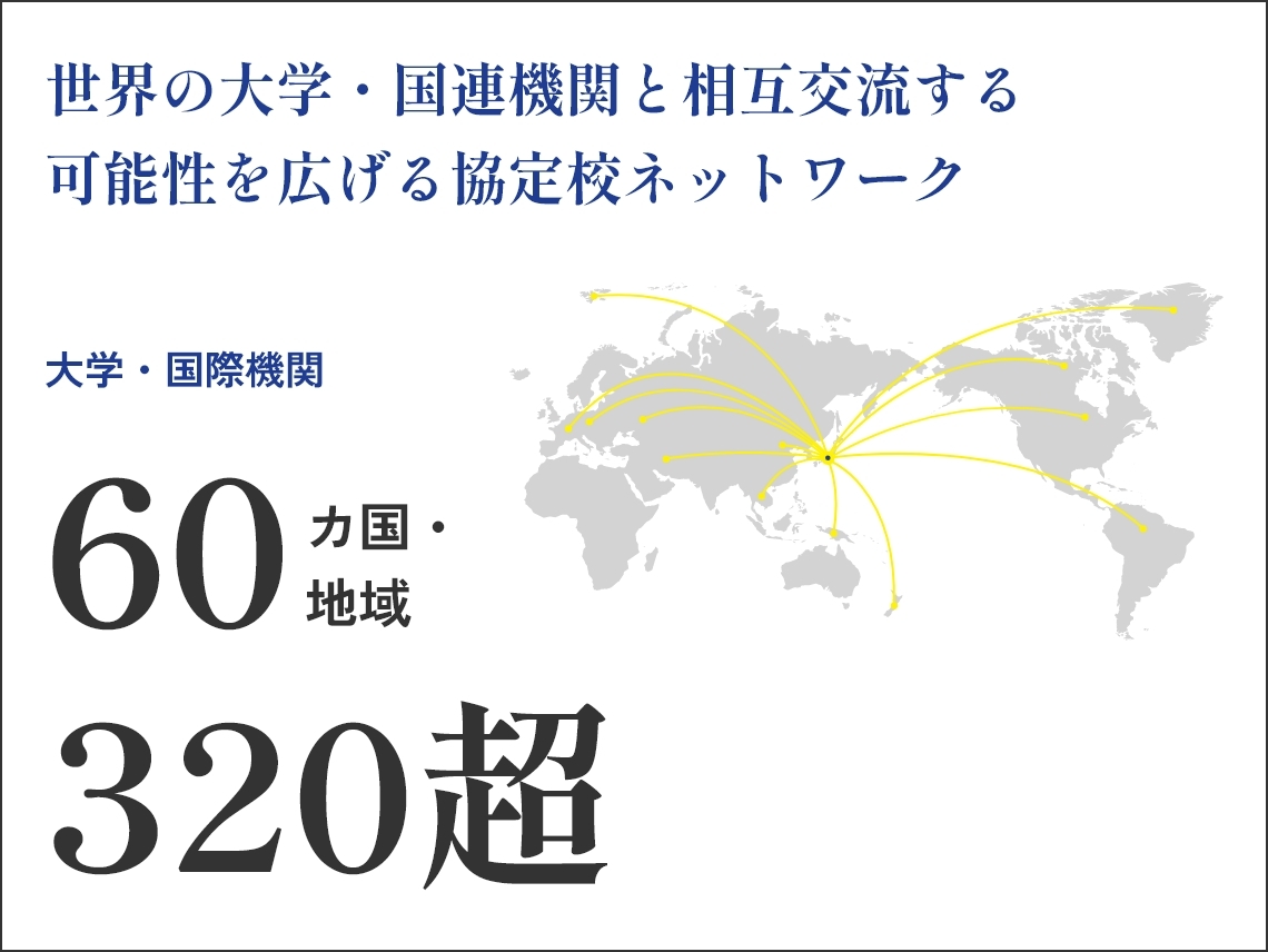 世界中の海外大学・機関と協定を結び、さまざまな留学プログラムを用意しています。また、外国人留学生も多数受け入れているため、学内でも多彩な国際交流が行われています。