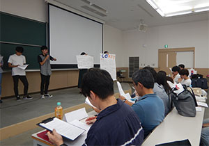 6月から本格的に班での話し合いを始め、約3か月間の成果を各班発表しました。審査員は支援室長(教員)、専従コーディネーター(職員)、学生CO4年生など5名。