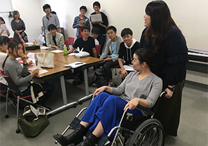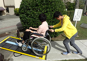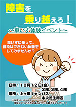 9月に実施した「1回生コンペ」の優勝チームが考えたこの企画。車イスで生活する大変さを知り、車イスの方のお手伝いを日頃からできるようにしておこうという思いからこのイベントを企画しました。