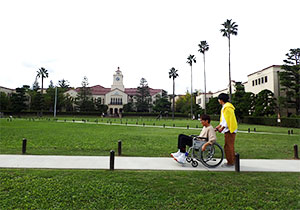 実施にあたり、まずは学生CO自身が車イスの扱い方を学んでおこうと、キャンパス自立支援室の協力のもと、車イスの操作方法などを学びました。初めて車イスに乗る学生も多く、押し手をいかに信頼するかが乗っている人にとっては重要かということを学んだようでした。