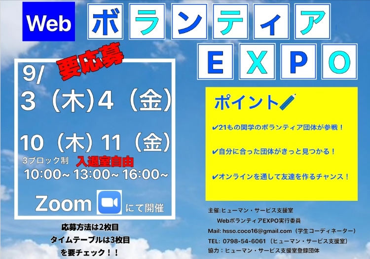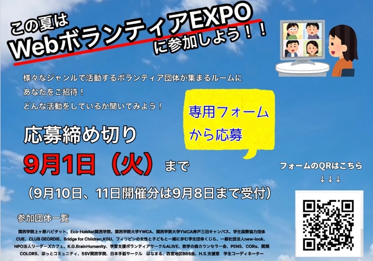 「新学期から、何かを始めたい」「関学での大学生活について知りたい」という方にもってこいのイベントとして、9月初旬にZoomで「WebボランティアEXPO」を開催しました。