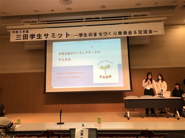 2024年2月17日(土)、三田市で行われた「三田学生サミット」に、学生CO2名が参加しました。このサミットは三田市と関西学院大学の学生による「こみんか学生拠点」との共催イベントで、まちづくり活動にかかわる学生の発表と、学生・市民の皆さんとの交流会を主な内容として開催されたものです。