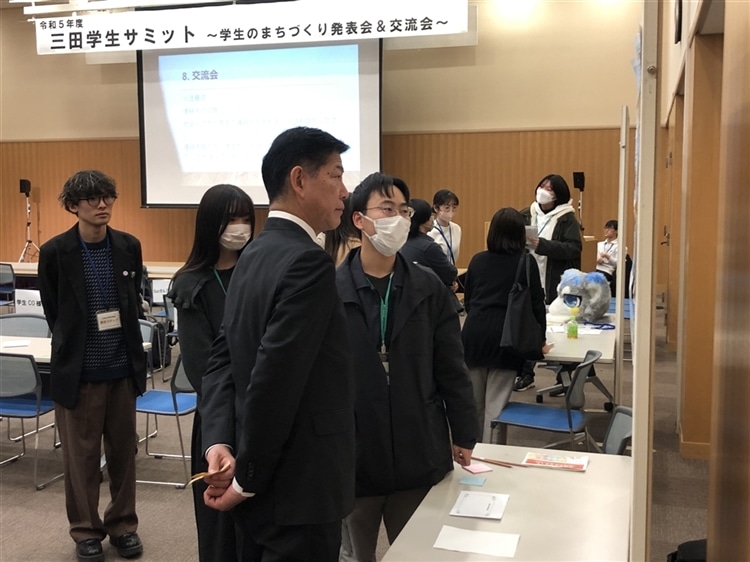 交流会では、田村市長をはじめ多くの団体に学生COブースを訪れていただきました。