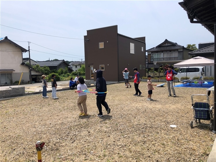 開始すぐに子どもたちがやってきて学生たちとフラフープやしゃぼん玉、的当てなどで元気に遊んでいました。