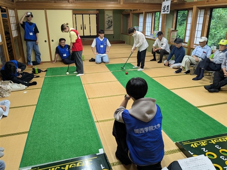 2日目は、豊田集会所での地元老人会の方々との交流会(スカットボール大会)と、新町会館での交流イベント(うちわ作り、茶話会、子ども遊びなど)を行いました。スカットボール大会では、学生と住民の方がペアを組んで白熱した対決を繰り広げました。ハイタッチをして喜び合ったり、握手をしてたたえ合ったりと、試合以上に温かい交流ができたことでとても充実した時間になりました。新町会館でのイベントについても、雨にもかかわらず多くの方にご参加していただくことができ、とても喜んでもらいました。「こんなにたくさんお話できたのも久しぶり」「今月も楽しみにしていました!」とも言っていただき、わずかな時間でしたが、少しでも心が安らぐ時間になったのではないかと思います。