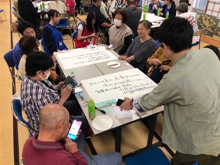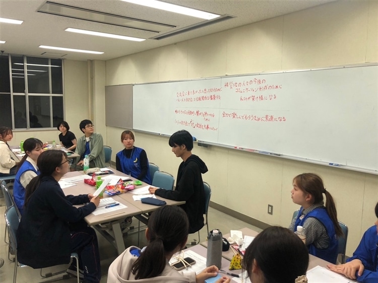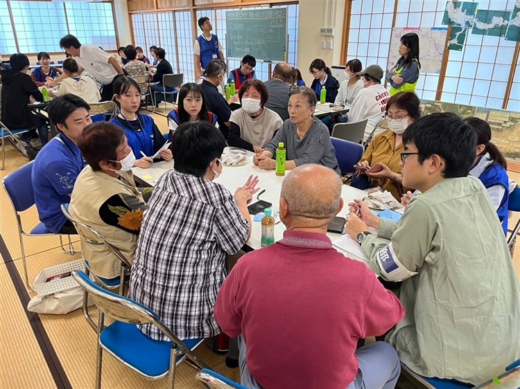 また、この日は初めての試みとして、七尾市豊川地区の皆さんとの交流会を行いました。交流会前にはまず豊川地域協議会 分館長の井田さんのご案内で豊川地域のバスツアーを行い、地域の状況について知ることができました。また、交流会は豊川地域協議会との連携で実現ができた会で、「今だから考えるべき将来の起こりうる災害に備えて」をテーマに、学生と住民の方々が4つのグループに分かれて話し合いました。住民の方々からは地震の日どのように過ごしていたか、どこに避難をしたか、避難生活がどのようなものだったかなどのお話があり、学生たちは熱心に耳を傾けていました。また話し合いを通じて地域コミュニティがあったからこそ有事に支え合うことができることを実感し、平時にどのように近くに住む人とコミュニティや関係性を作っていくか、等を考えていました。次回以降も交流の機会を持ち、災害の教訓をより発信する方法や、豊川地区で学生たちとできることなどを考えていきたいという意見もあったので、引き続き豊川の皆さんとのつながりを大切にしたいと思います。