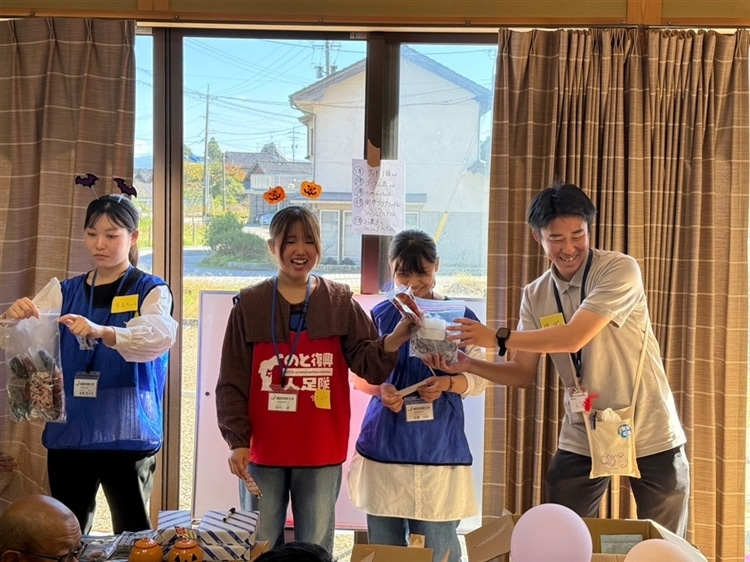 最終日の3日目は、午前にハロウィン装飾づくり、午後にハロウィンビンゴ大会を行いました。装飾づくりではかぼちゃやおばけの飾りを折り紙などで作ったほか、チェキで思い出を写真に残して学生がメッセージを書いてお渡しするなど交流を行いました。また並行して、体調や都合によりイベントには来られない方々にも水をお届けするなどして、交流をしました。ビンゴ大会は学生が司会進行を務めて盛り上げながら、約30名の住民の方々と学生たちが一緒に混ざって楽しむことができました。最後には、学生から「皆さんが温かく迎えてくださったことが私にとってもとても大きな経験になりました。自分たちにできることはあるのかと緊張していましたが、皆さんが笑顔で楽しんでいただいて嬉しいです。ありがとうございました!」などの感想を伝えて、交流イベントを締めくくりました。