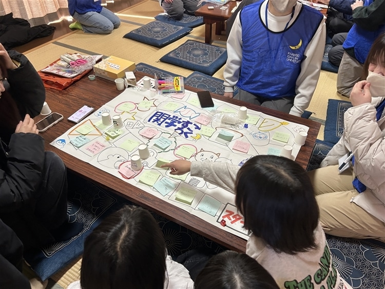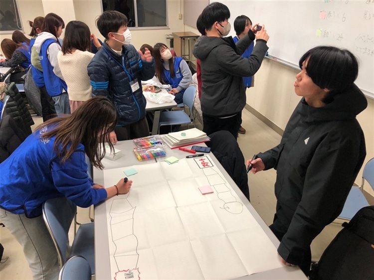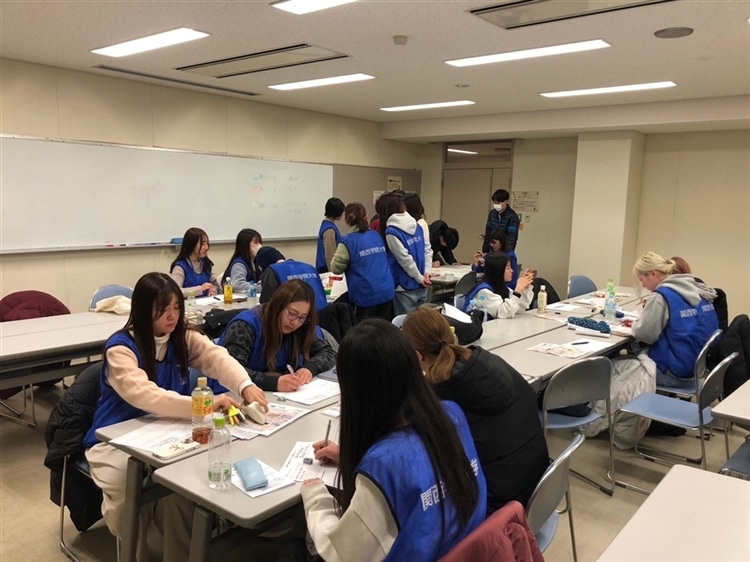 この日の活動の振り返りでは、戸別訪問の活動内容について学生全員で共有を行い、翌日に向けて具体的な行動をイメージして明日に臨もうと話し合いました。また、翌日の活動に使用する「手作りすごろく」の作成も行いました。学生が中心となって各マスの内容を考えたり、絵を描いたりして、世界に一つだけの「関学すごろく」が完成しました。