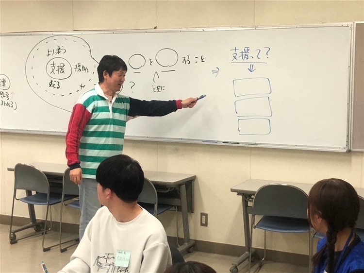 この日の活動の振り返りでは、「支援とは」をテーマに、支援するための自分たちの強みと弱みの2つの視点から考えました。学生からは「人の気持ちを考えること」、「不便や不自由を感じている人の生活をよりよくしていくこと」などが上がり、どんな世代とも近い関係性が築けることや若さが強みである一方で、人生経験の少なさや専門性がないなどの弱みもあるなどの意見がありました。振り返りを通して「支援」の難しさを知るとともに、学生一人ひとりがこの活動が終わっても自分たちができることを考える貴重な機会にもなりました。