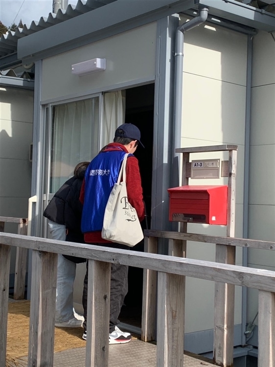 1日目は、2日目に行う会館でのイベントのお知らせを兼ねて、仮設住宅と新町地域で戸別訪問を行いました。学生たちは関学新聞やカイロをお届けするとともに、住民のみなさんの日常の困りごとなどに耳を傾けました。