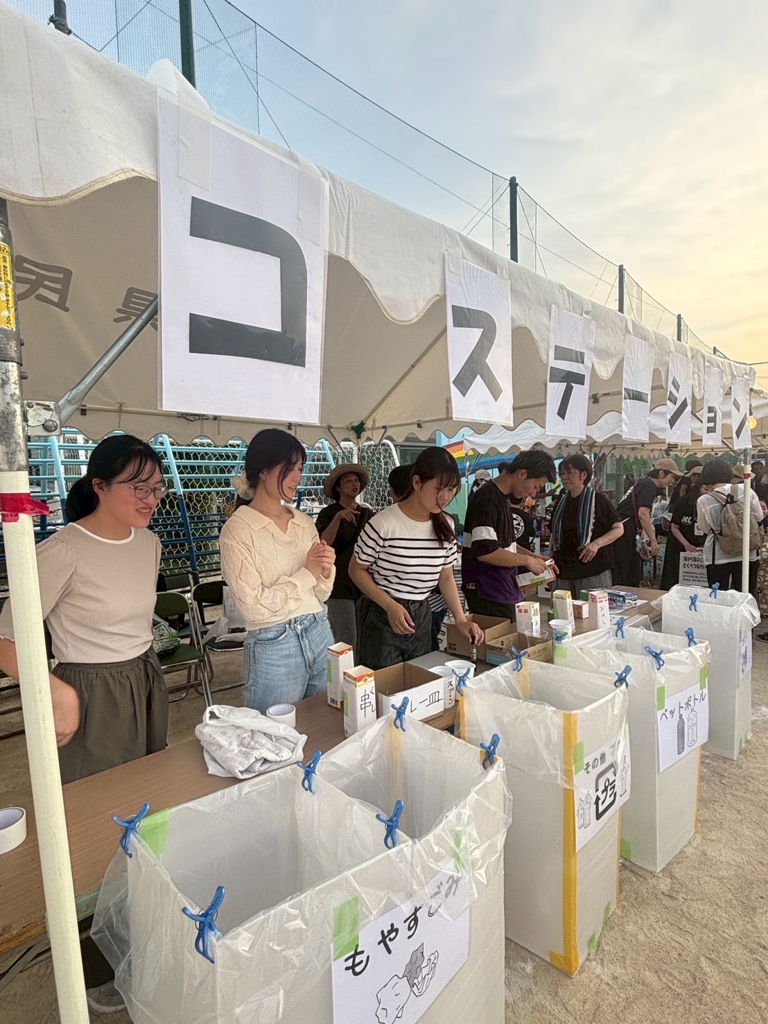 2025年8月23日(土)、学生コーディネーター(学生CO)の「エココミュニティチーム」メンバーは、甲東エココミュニティ会議の方々とともに、甲東地区夏祭りのエコステーションを担当しました。当日は多くの模擬店が出店しており、ゴミの種類も多岐にわたりました。そのため、燃えるゴミ・燃えないゴミの分別に加えて、ペットボトル、その他プラスチック、カレー皿、串、ラムネの瓶、缶、割り箸、フランクフルトの器など、細かく分けて回収を行いました。来場者には分別方法を伝え、できる限り自分で分別してもらうよう呼びかけました。子どもたちは最初戸惑いながらも、自分でゴミを分けられたときには、嬉しそうな表情を見せてくれました。その姿から、分別がただの作業ではなく「学び」や「気づき」になることを実感しました。このように夏祭りという楽しい場で分別を体験することは、子どもたちにとって「ゴミを分けるのは当たり前」という感覚を育てる大切な機会になると思います。そして、その意識が家庭に持ち帰られることで、保護者の方々にも自然と広がっていくと感じました。今後も地域行事を通じて、子どもたちが楽しく分別を学び、その意識が地域全体に広がっていくよう取り組みを継続しながら、関学生がボランティアに参加するきっかけづくりにつなげていきたいと思います。(エココミュニティチーム 鎌田 結衣)