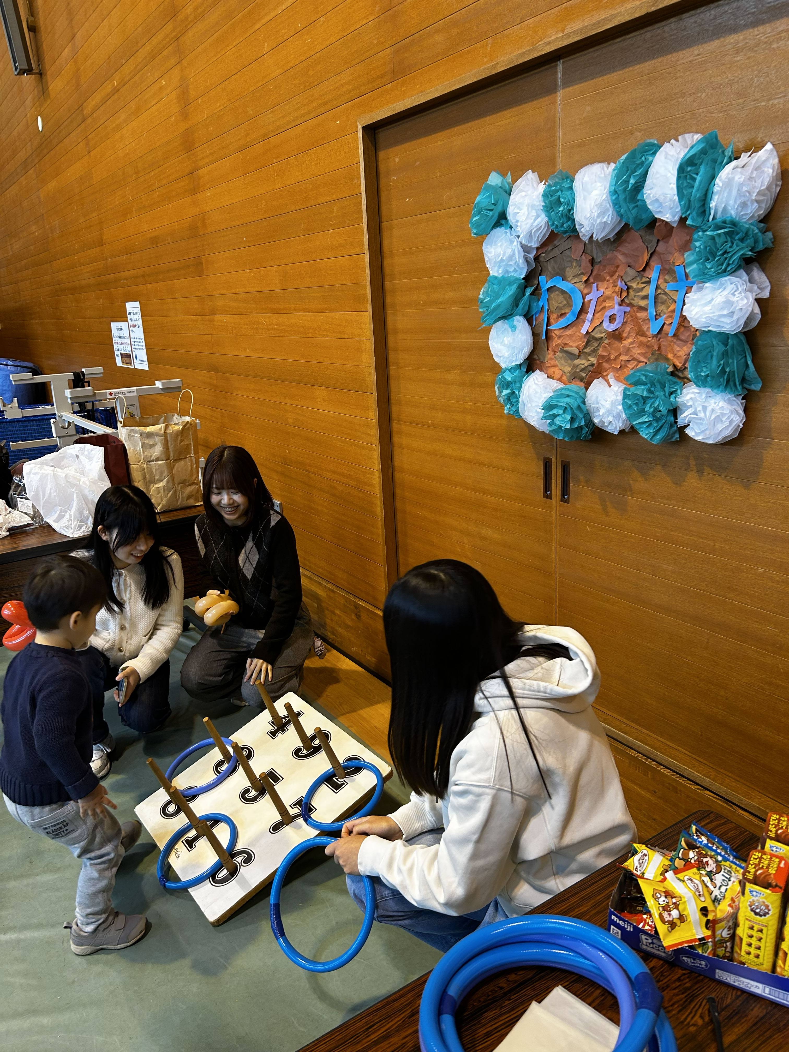 当日は、学生コーディネーターとボランティア参加者で、会場の設営、ボウリング・輪投げ・千本引きの運営、そして片付けを担当しました。
