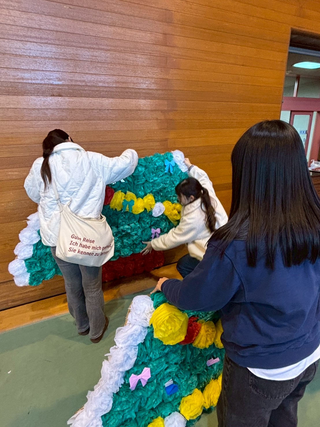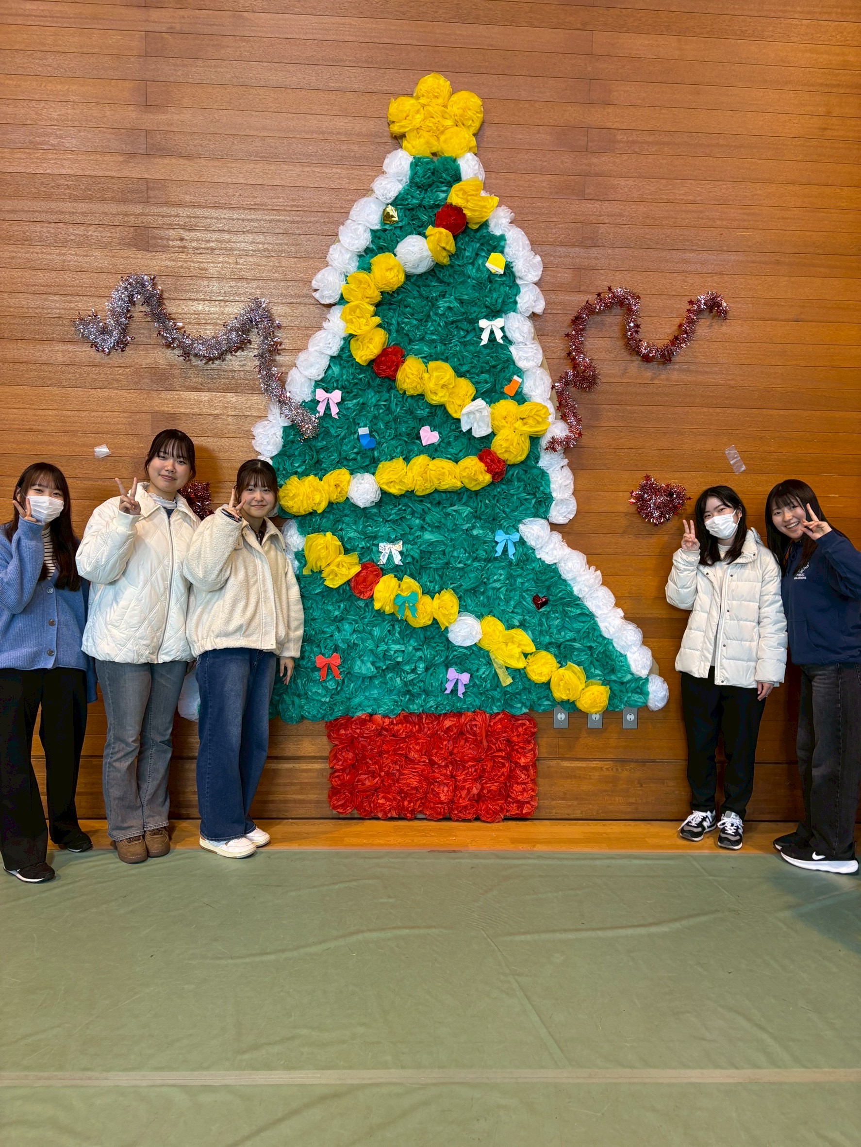 学生COは事前の準備にも携わり、「ボランティアweek」企画と連動して参加者とともにバルーンアートを景品として制作したほか、花紙で作ったクリスマスツリーを掲示しました。当日はフォトスポットとして多くの方にご利用いただきました。