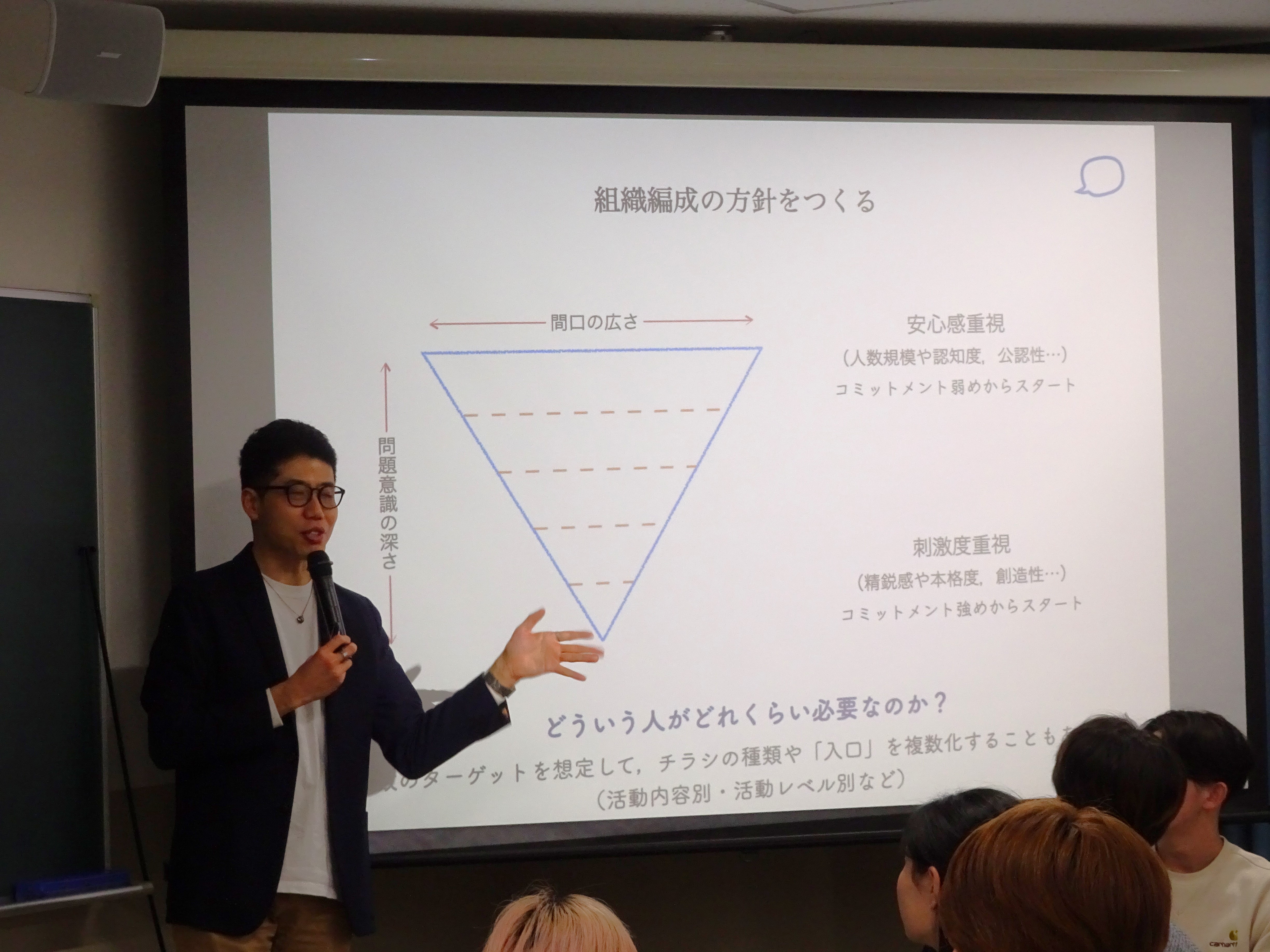 関西学院大学人間福祉学部社会起業学科専任講師で、ファシリテーターとして各地の市民や大学生と関わる川中大輔先生を講師としてお招きし、「呼び込み×巻き込み」の2つの視点でのアプローチについて、様々な団体の実践例を踏まえてレクチャーしていただきました。