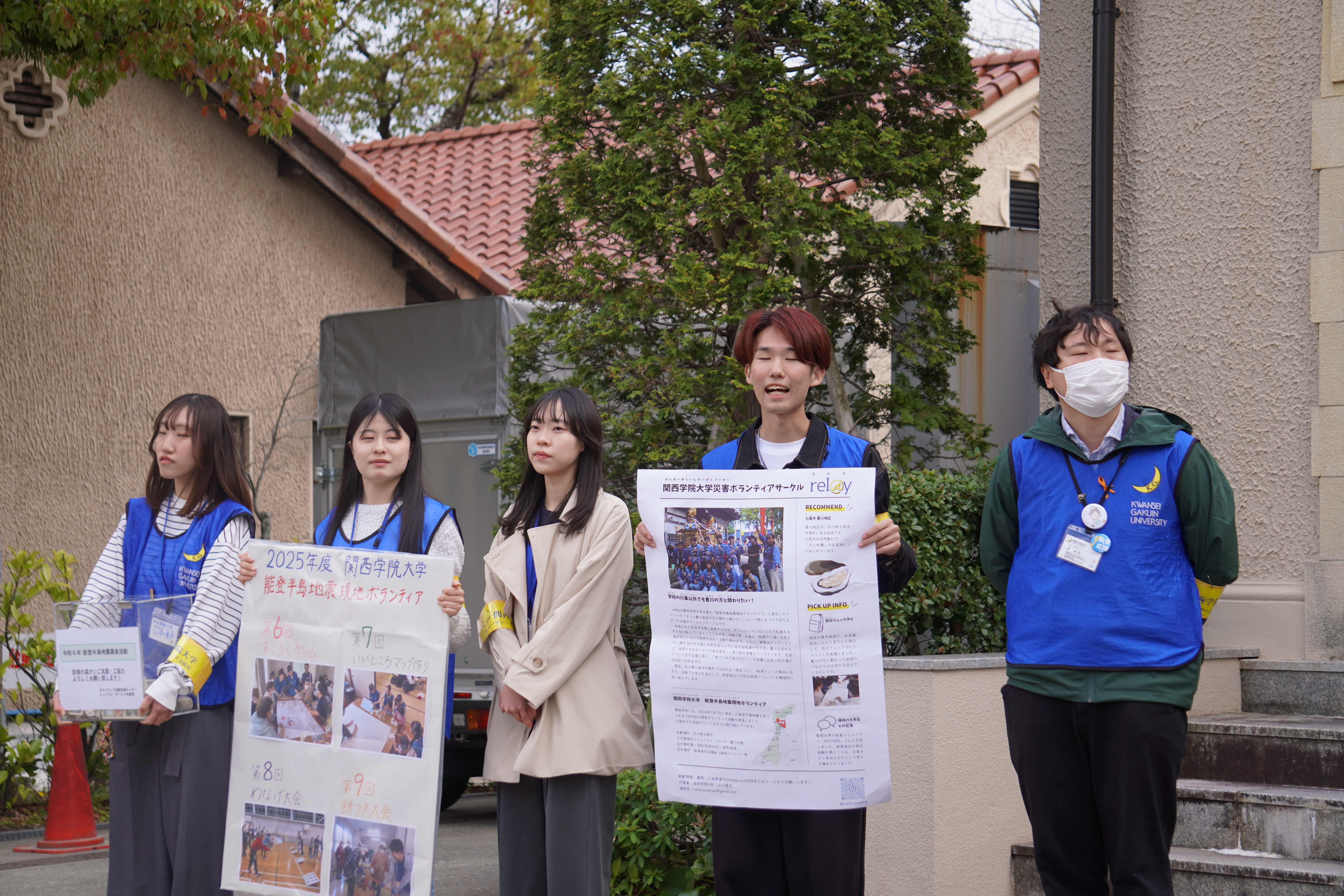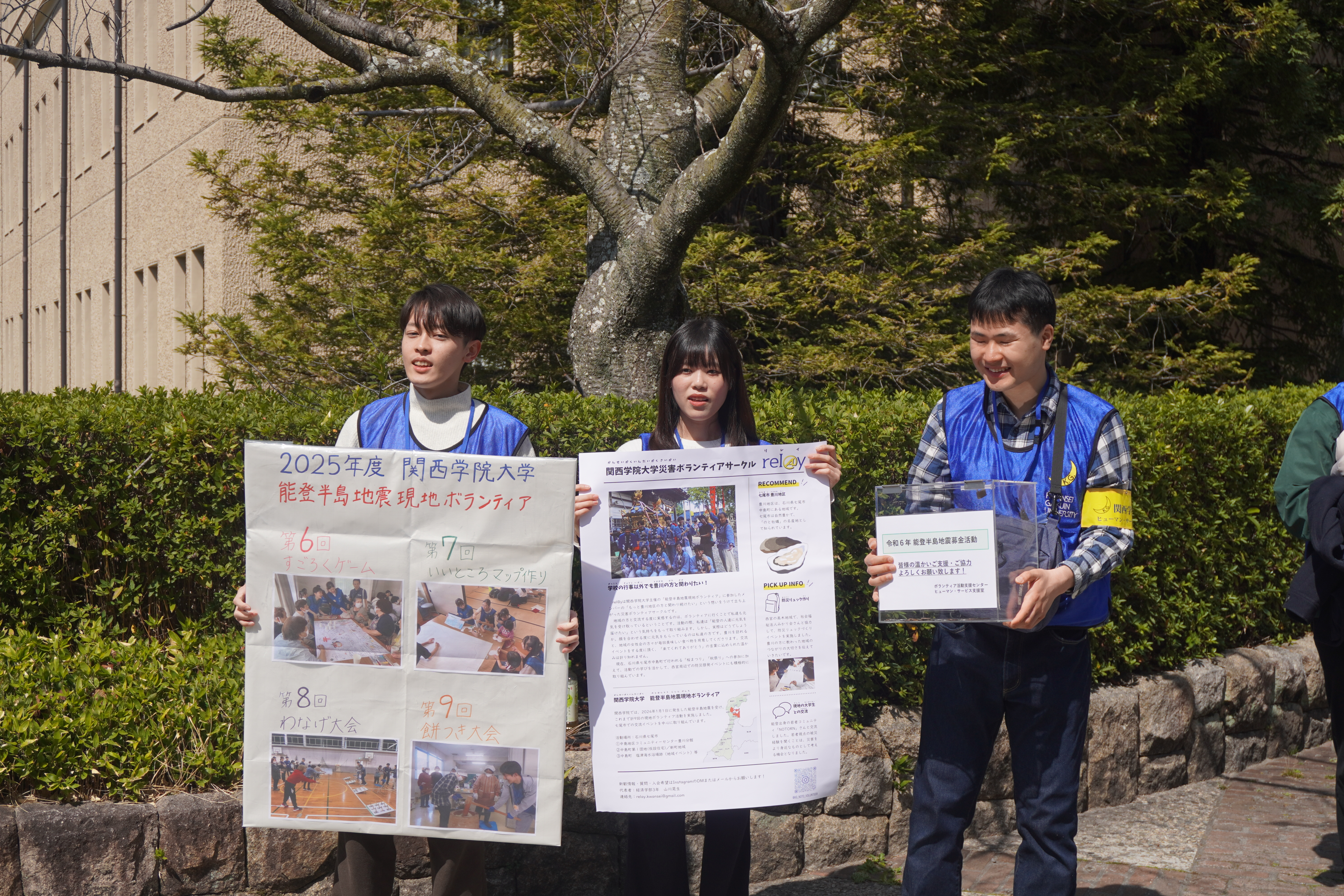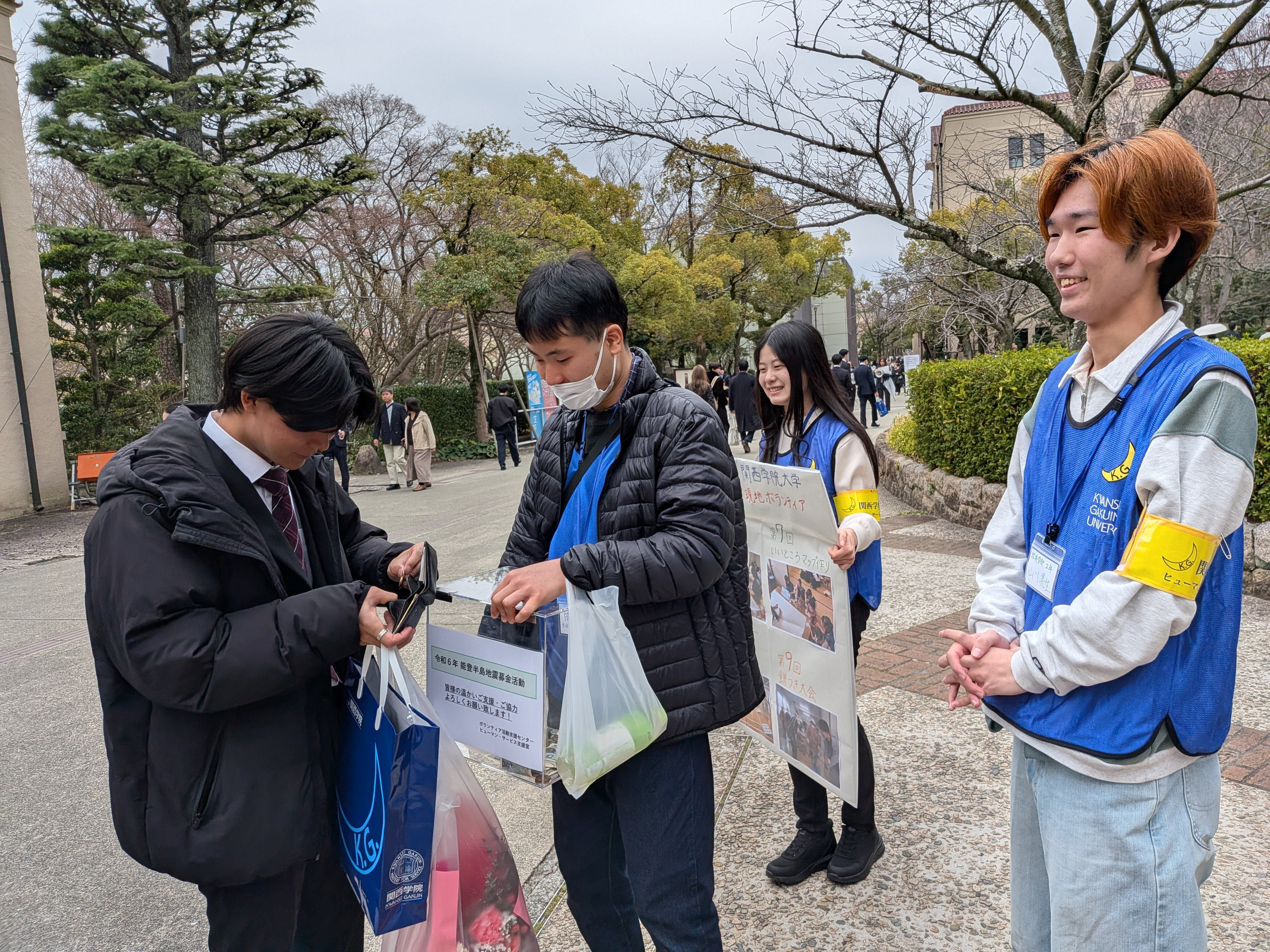 能登半島地震に対しては多くの学生より自分たちで継続して何かできることがないのかという声が届けられました。このような状況を鑑み、ヒューマン・サービス支援室の管理運営のもと、今年度も学生による募金ボランティア活動を関西学院大学2025年度卒業式・2026年度入学式に実施しました。当日は学生だけでなく保証人の方々からも支援が寄せられました。