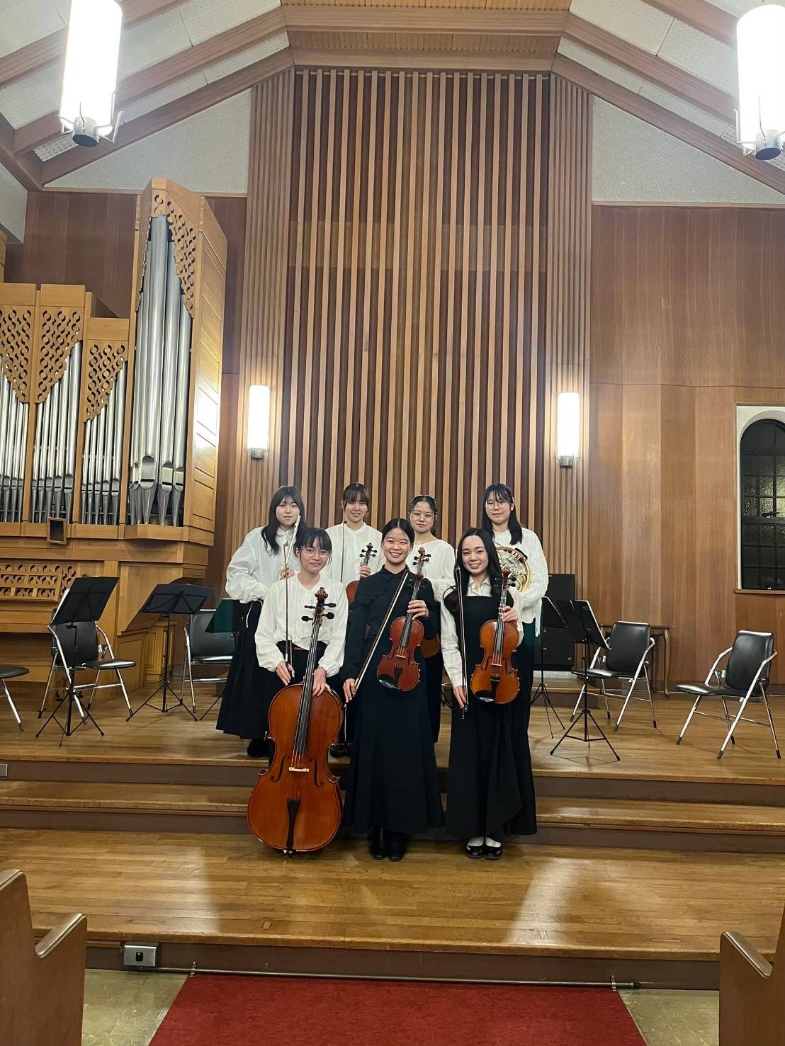 室内管弦楽団として、演奏のジャンルはバッハ、モーツァルト、ヘンデルなどヨーロッパの中世から近世の室内管弦楽を中心に美しい音色を各学部のチャペルや学外の教会、学校などで音楽による奉仕をしています。また、春と秋の定期演奏会やクリスマスコンサートでは誰もが一度は聞いたことのある親しみやすい曲を演奏しています。