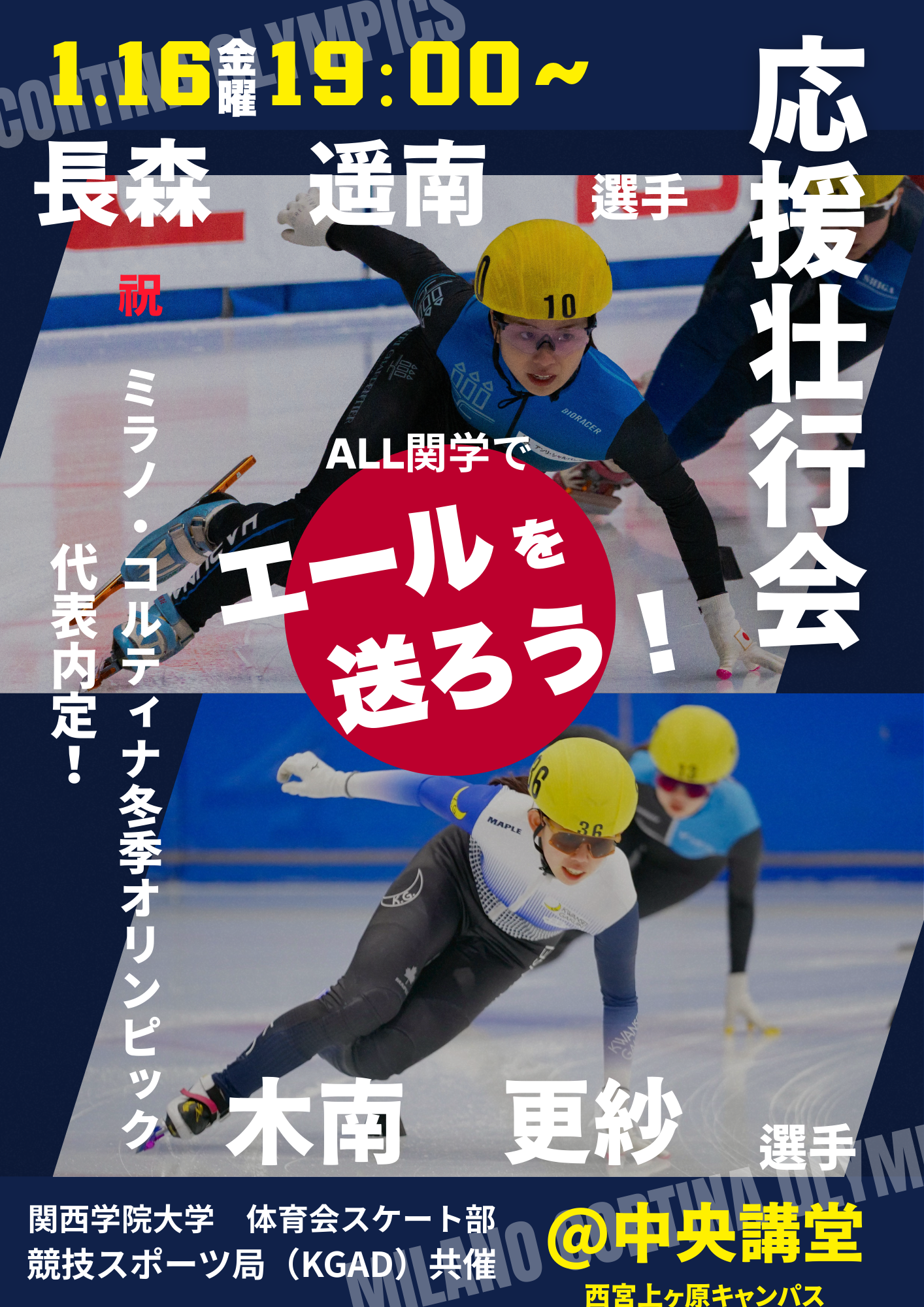 関西学院大学 西宮上ケ原キャンパスにて、1月16日(金)、第25回オリンピック冬季競技大会(ミラノ・コルティナ2026冬季オリンピック)のスケート/ショートトラック派遣選手団に選出された長森遥南さん(関西学院大学2024年度卒業)、木南更紗さん(関西学院大学法学部1年生)の壮行会を開催いたします。