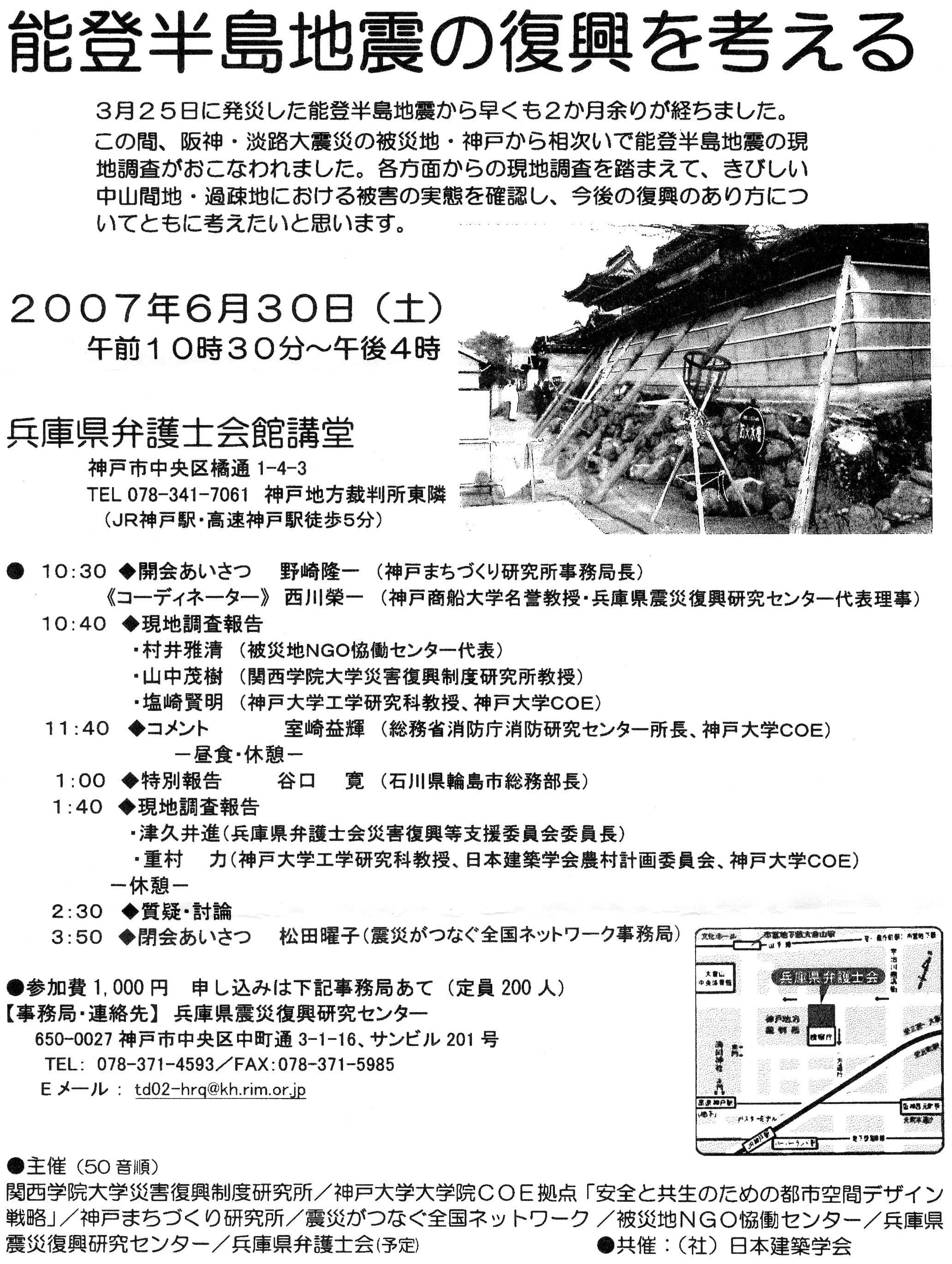 3月25日に発災した能登半島地震から早くも2か月余りが経ちました。4月末から5月にかけて阪神・淡路大震災の被災地・神戸から相次いで能登半島地震の 現地調査が実施されました。それらの現地調査の報告を踏まえて、今後の復興について考えるシンポジウムを下記の通り計画しました。 どうぞ、お誘い合わせ の上、ご参加いただきますようご案内を申し上げます。