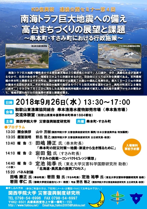近い将来発生が懸念される南海トラフ巨大地震に備えるため、災害復興制度研究所は昨年3月から企画しております連続公開セミナーの第4弾となる「南海トラフ地震への備え 高台まちづくりの展望と課題~串本町・すさみ町の行政施策」を9月26日、和歌山県串本町で開催いたします。
