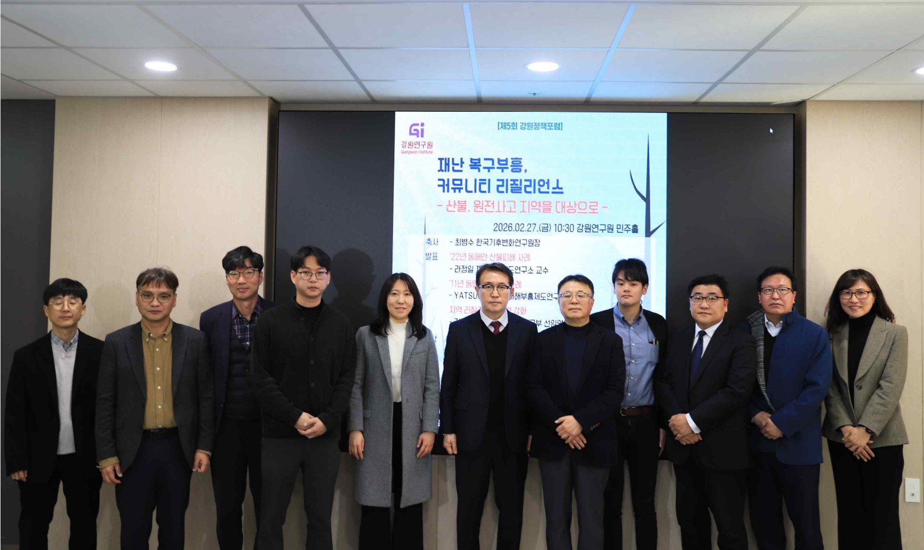 2026年2月27日(金)10:30~12:30、韓国・江原道にて「江原政策フォーラム/気候変化時代における常時化する災難への備えと災難回復力の強化」をテーマとした日韓共同フォーラムが開催されました。日韓の研究者・関係者12名が参加し、気候変動時代における災害対応と復興力強化について活発な議論が行われました。