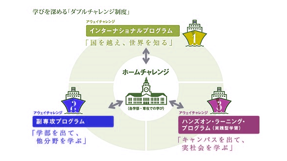 「インターナショナルプログラム」 (留学等の国際交流)、 「副専攻プログラム」 (他学部での体系的な学び) 「ハンズオン・ラーニング・プログラム」 (社会での実践型学習)の3つから構成される「アウェイチャレンジ」を通じて、グローバル人材に強く求められる「主体性」「タフネス」「多様性への理解」「チャレンジ精神」などを育むことを目指しています。
