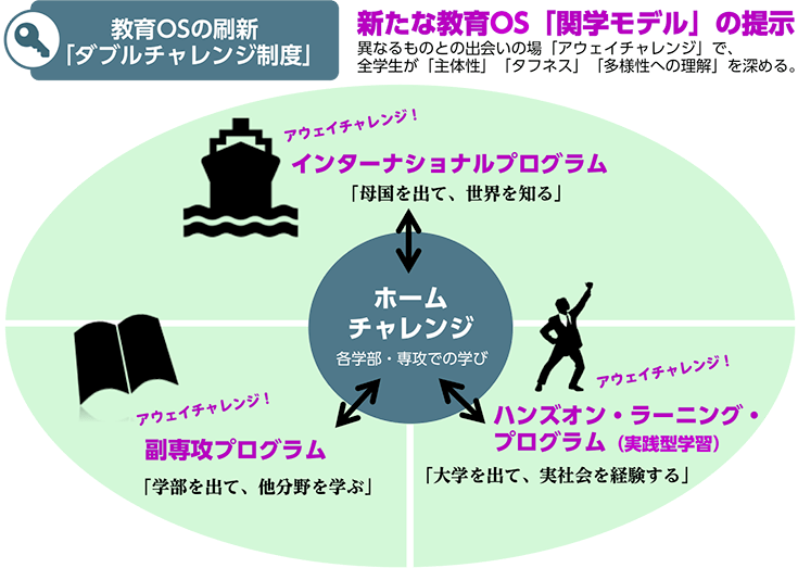 「ダブルチャレンジ制度」は、全学生が自身の所属学部や主専攻の学び(ホームチャレンジ)に加えて、異なるものとの出会いの場「アウェイチャレンジ」に挑戦する独自の教育OS(Operating System)です。アウェイチャレンジには「インターナショナル」(留学等の国際交流)、「ハンズオン・ラーニング」(社会での実践型学習)、「副専攻」(他学部での体系的な学び)の3プログラムを設けます。 「アウェイチャレンジ」を通じて、学生は、将来グローバルに活躍するために不可欠な資質、すなわち「主体性」「タフネス」「多様性への理解」等を身に付けます。