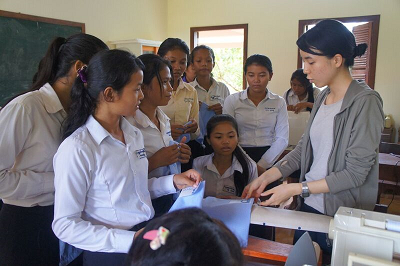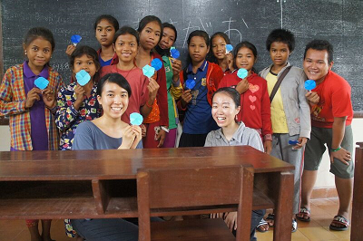 私はアンコールワットがあるカンボジアの観光地として有名なシェムリアップにある、カンボジア政府と日本人有志が共同で設立した現地NGOで、主に広報活動を中心にボランティア活動をしました。具体的には、このNGOが支援している中学校やカフェでの広報活動でした。さらに、このNGOは世界遺産であるアンコール遺跡群のひとつ、バイヨン寺院で修復作業を行う日本政府からの修復チームの現地パートナーでもあったので、修復作業の様子等についての広報や、日本人観光客に向けての案内も行いました。また、本学から主に教育担当として派遣されていたもう一名のボランティア学生と一緒に、現地の中学で週一回ほど、日本語や音楽、美術等の副教科を教える活動もしていました。