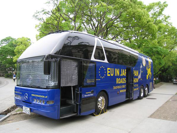 バスは西宮上ケ原キャンパス中央芝生横(多分献血バスの駐車地点と同じところの予定)でEUに関する情報セット(資料、グッズ:ユーロキティ、マウスパッド、エコバック等)の配布等を行いました。