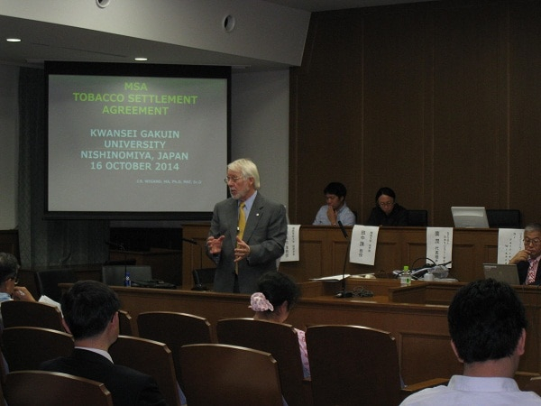2014年10月16日(木)、講師にJeffrey Wigand(ジェフリー・ワイガンド)氏、関西大学法学部教授田中謙氏、NPO法人日本タバコフリー学会代表理事で、西宮保健所長でもある薗潤氏をお迎えし、講演会「アメリカにおけるタバコ集団訴訟とタバコ産業」を開催しました。