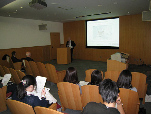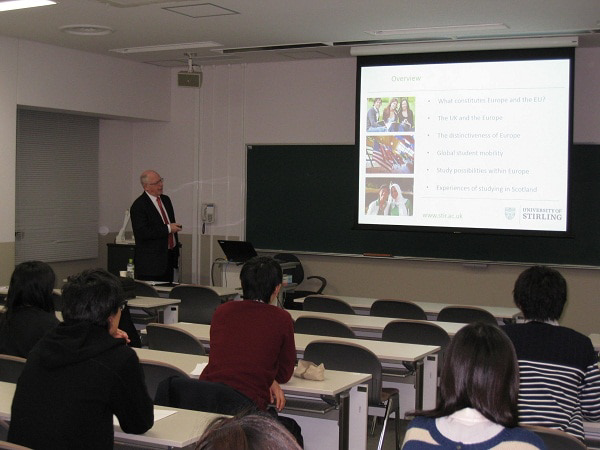 スターリング大学は本学とも深い協力関係を持ち、交換留学などを行っています。講演会ではEU加盟国の大学で学習する意義と可能性についてお話いただきました。欧州における大学教育に関心のある学生が積極的に参加し、質疑応答が活発に行われました。