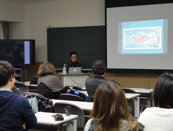 2014年12月10日(水)トルコ文学翻訳家で、ムラト=ヒュダヴェンディガル大学文理学部シェイマ研究室リサーチ・コーデネータの井藤聖子氏をお迎えして、講演会「トルコ入門」を開催しました。トルコの地理、歴史、言語、文化、現代のライフスタイルなどについて、トルコ滞在のエピソードも交えながら講演いただきました。