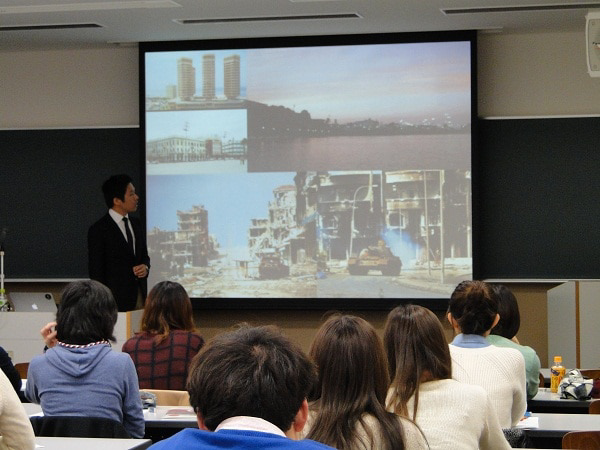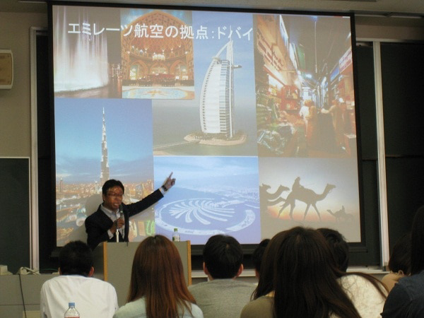 エミレーツ航空が本拠地を置くドバイの歴史、エミレーツ航空の発展の経緯、さらに現在の航空業界が今後どのように展開するか、残されている課題も踏まえてご講演いただきました。その後質疑応答の時間が設けられ、多くの学生から質問がありました。