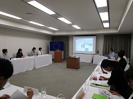 駐日欧州連合代表部のリチャード・ケルナー氏による「日・EU関係」のプレゼンテーションをはじめ、各館の活動報告、レファレンス・トレーニング、EU情報センターの利用を向上させるためのワークショップなどに加え、本学産業研究所アンナ・シュラーデ准教授と国際学部のホルガー・ブングシェ教授による講演等がありました。電子化が進む今後の情報提供における提案や意見交換も行われ、大変有意義なセミナーとなりました。