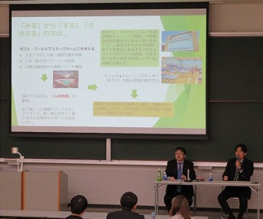 2019年のラグビーワールドカップ、2020年の東京オリンピック・パラリンピック、2021年のワールドマスターズゲームズ、と、大規模な国際的スポーツイベントが連続して日本で開催され、「奇跡の3年」とも言われるが、では、ポスト・ワールドマスターズゲームズはどうなるのか?北川氏はこれついて、2025年の万博、IR誘致、万博跡地の大規模アリーナ構想などが挙げられているが、人材育成の視点が抜けているのではないか、と問いかけ、次の世代が「本物をみる」経験をすることの大切さに触れ、「みる」から「する」へ、そして、「する」から「ささえる」へ、そして「ささえる」の次の段階として、人材育成が大事であり、次のスポーツ人材を関西から生み出すために万博跡地などにナショナルトレーニングセンターを建設する、などのアイデアを提言されました。