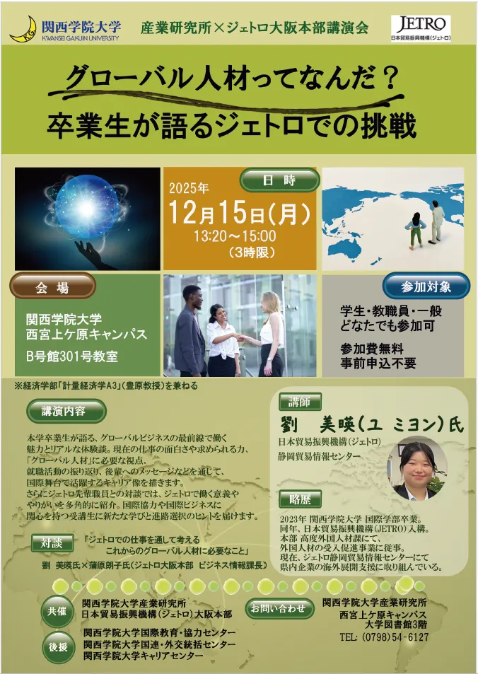 <産業研究所×ジェトロ大阪本部講演会>グローバル人材ってなんだ?卒業生が語るジェトロでの挑戦 [12/15開催]