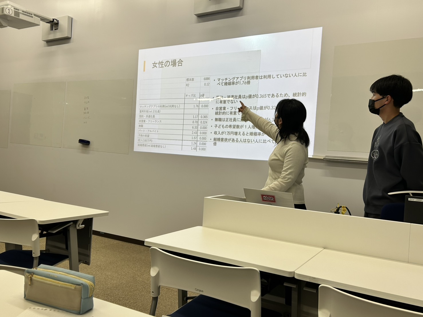 その事実とは、「婚外子の少ない日本社会において、婚姻率の低下は少子化に直結し、人口減少という社会課題の根幹にある」ということです。婚姻率を下げる要因を作っている当事者世代といえる私自身が、あえてこの現象を研究対象とすることで、定説とは違う新しい世界が見えるのではないか。そう考え、所属ゼミの学生とともに2名で研究を進めています。私の担当は、「マッチングプロセス(出会い方)」の分析。近年急増しているマッチングアプリが、婚姻率や結婚の質にどのような影響を与えているのか。現代ならではの出会いの形に注目し、自分なりの答えを出そうと試行錯誤しています。
