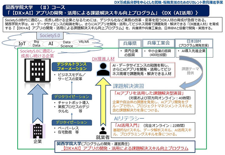 本大学の『【DX×AI】アプリの開発・活用による課題解決スキル向上プログラム』は、兵庫県や兵庫工業会、日本IBMと協力・連携しながら、昨年7月から完全オンラインにて提供している「AI活用入門」に加え、2022年度新たに開発した「AIアプリを活用した課題解決型演習」をセットで学習・修了することで、社会で不足する「DX推進人材」の輩出をめざします。