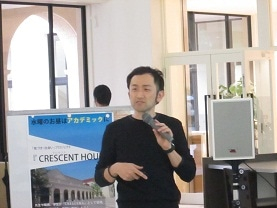 クレセントアワー初の学生の「CRESCEN人」。落ち着いた語り口調で、ケニアでの留学中に撮影した写真を紹介しながら現状を説明してくれました。ゴミやトイレが不便であったりの問題点も多々ある中、実は映画館があったり学校は無料で給食もあるなど充実している部分もあるとのこと。何より皆が笑顔であったとのこと。説明の後、参加した50名の学生と討論会に発展。意見が飛び交い学生同士充実した時間を共有していました。