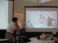 学生が講壇者という事で、和やかに始まったクレセントアワーですが、高校時代の数理学部の研究発表の内容をアニメーションでスクリーンに映した瞬間に会場がどよめきました。その内容はもちろん、映像技術の素晴らしさわかりやすさに参加した学生も「驚愕でした」との感想を漏らしていました。たまたま近くにいた学生たちも話に引き込まれて会場の50名全員が静かに話に聞き入っていました。