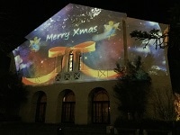 クリスマスをテーマに、自分たちで制作したプロジェクションマッピングを体育館の壁面に投影しました。