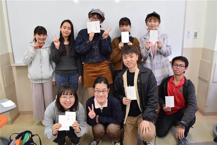 留学生を対象にペン字教室を開催し、氏名と好きな言葉を練習し、一人一作品を完成させました。