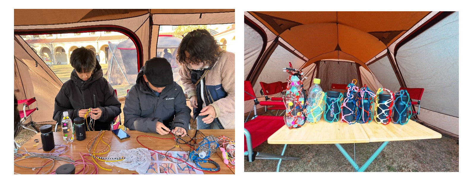 同じデザインのボトルを多くの学生が使用していることから、「自分のマイボトルが見分けづらい」という利用者の声を、CAMP×US®のメンバーがSnow Peakに投げかけ、Snow Peakの紹介によりパラコード専門店「Paracord Factory」を講師に迎え、今年10月にワークショップを行いました。今回は、10月に実施したワークショップよりもレベルの高いアクセサリー制作に挑戦し、苦戦しながらもそれぞれがこだわりを持って制作に取り組みました。