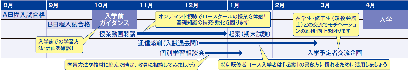入試合格者全員を対象に、入学前ガイダンスを実施しています。合格 から入学までの学習や、入学前学習プログラムの内容・活用方法を紹 介します。また、在学生との座談会では、入学を決めた理由や、実際の ロースクール生活、学習アドバイスなどをざっくばらんに聞くことができる 機会を設定しています。