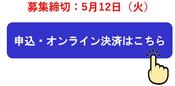 こちらから「申込・決済」へお進みいただくことができます。 オンライン申込・決済となりますので、クレジット決済をご希望の方はお手元にクレジットカードをご準備のうえ、お申込ください。 ※コンビニ決済[現金払い]可能。